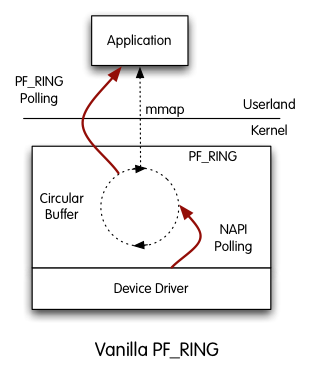 PF_RING™正在通过Linux NAPI轮询来自NIC的数据包。这意味着NAPI将数据包从NIC复制到PF_RING™循环缓冲区,然后userland应用程序从环读取数据包。在这种情况下,有两个轮询程序,即应用程序和NAPI,这会导致用于此轮询的CPU周期。优点是PF_RING™可以将传入的数据包同时分发到多个环(因此有多个应用程序)。