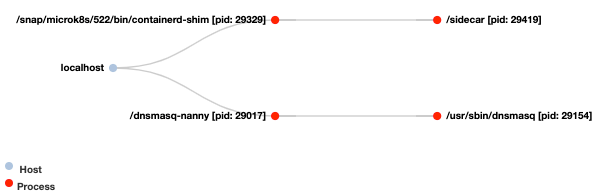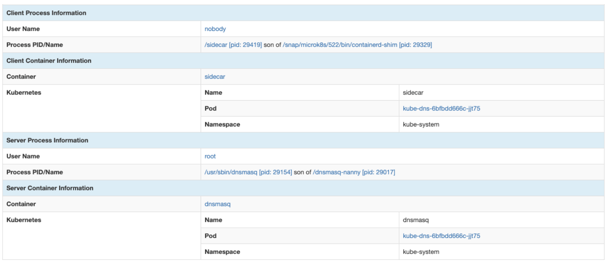 以下是nProbe™Agent发现的网络通信,该通信在进程之间进行/sidecar在容器内运行/sidecarKubernetes POD的一部分kube-dns-6bfbdd666c-jjt75,和过程/usr/bin/dnsmasq在容器内运行dnsmasq同一Kubernetes POD的一部分。