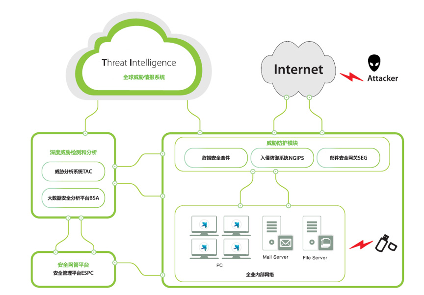 至诚威胁防御解决方案,包含了威胁分析系统TAC,入侵防御系统IPS,邮件安全网关SEG,终端安全产品,以及综合安全管理平台,绿盟威胁情报系统。通过模块间的关联协作,检测和防御进入企业的全部威胁,对网络、邮件、终端等传统安全威胁进行检测防御,也对APT高级威胁进行检测和防御。